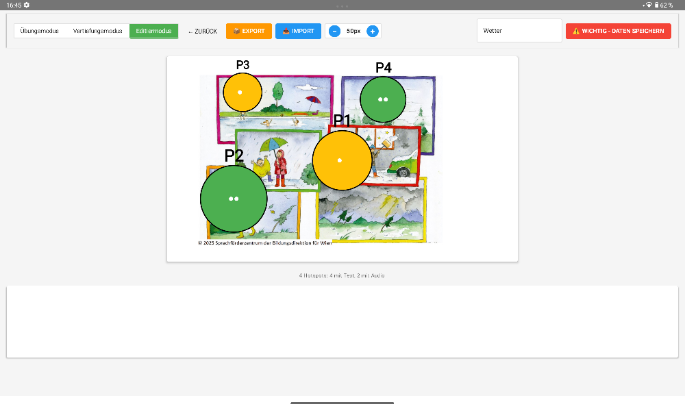 „Nomen est Omen“ trifft dieser App-Name „QUASSELO“ genau. Wie das intensive „QUASSELN“ im Alltag kann ein Text in der Textbox als gesamter Text vor-gequasselt / gelesen werden oder im Text können Wörter vorwärts / rückwärts einzeln vorgelesen werden oder auch mehrmals wiederholt werden. Die synthetische Wiedergabe wird als TTS (text to speech) bezeichnet.