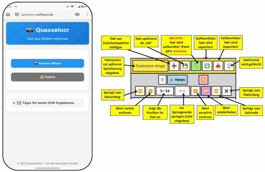 Als Ergänzung zur „QUASSELO“-App gibt es die QUASSELLOCR“-App, die aus Fotos oder Bildern Text extrahieren kann. Diese OCR-Technik (englisch optical character recognition) bezeichnet die automatisierte Text- bzw. Schrifterkennung. Dieser extrahierte Text wird in die Textbox eingefügt.