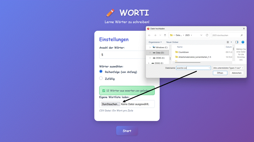 Nach dem Prinzip der Buchstaben / Zeichen nachschreiben können mit dieser Web-App „WORTI“ aus einer Wortliste, welche hochgeladen werden kann, ganze Wörter geschrieben . Das gesamte Wort kann mit TTS (TextToSpeech) ausgesprochen werden.
